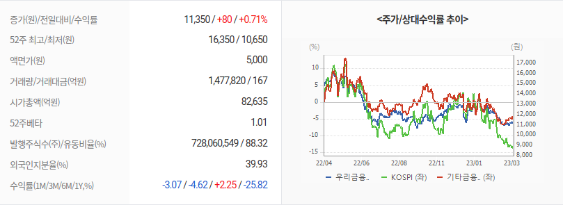 2023년 04월 05일 기준으로 우리금융지주의 주당 가격은 11,310원 입니다.