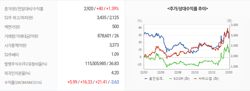 2023년 03월 17일 기준으로 웅진씽크빅의 주당 가격은 2,920원 입니다.