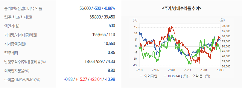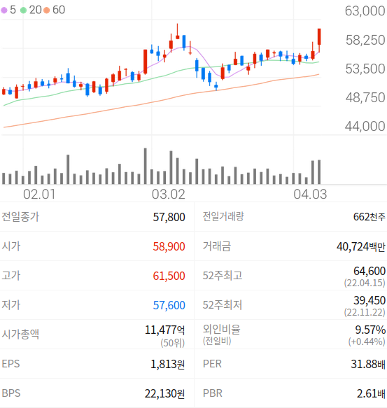 2023년 04월 06일 기준으로 와이지엔터테인먼트의 주당 가격은 57,800원 입니다.