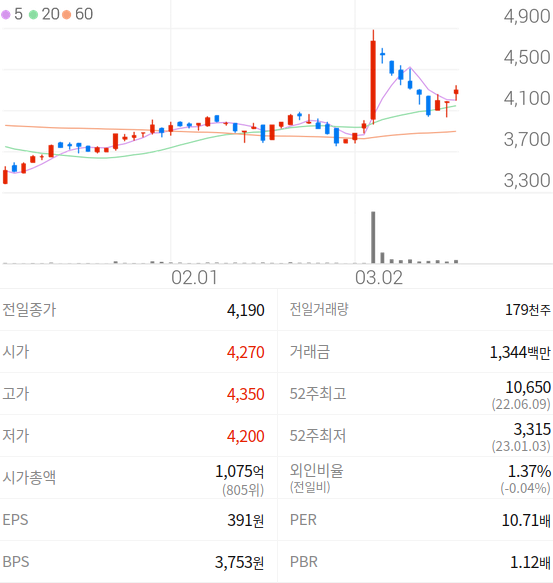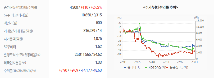 2023년 03월 17일 기준으로 유니테크노의 주당 가격은 4,300원 입니다.