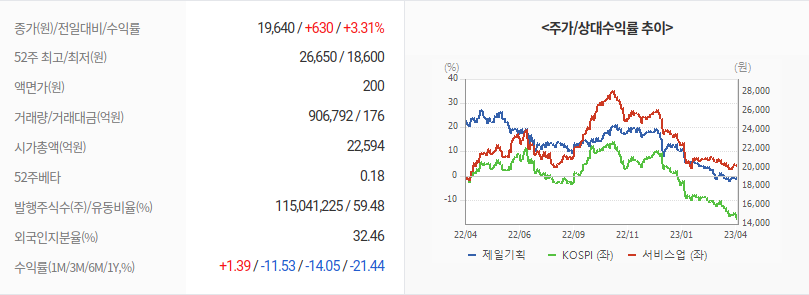 2023년 04월 12일 기준으로 제일기획의 주당 가격은 19,640원 입니다.