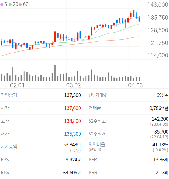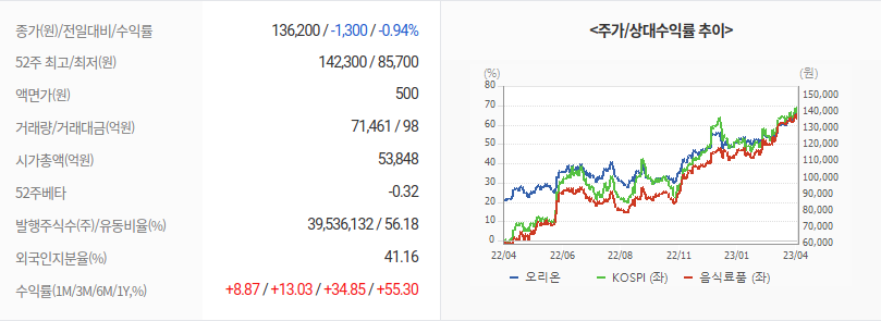 2023년 04월 07일 기준으로 오리온의 주당 가격은 136,200원 입니다.