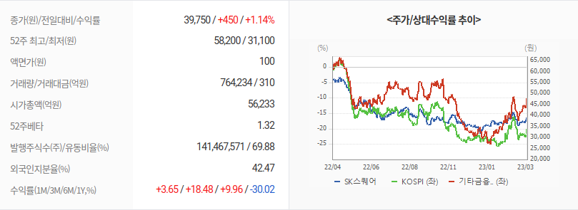 2023년 03월 31일 기준으로 SK스퀘어의 주당 가격은 39,750원 입니다.