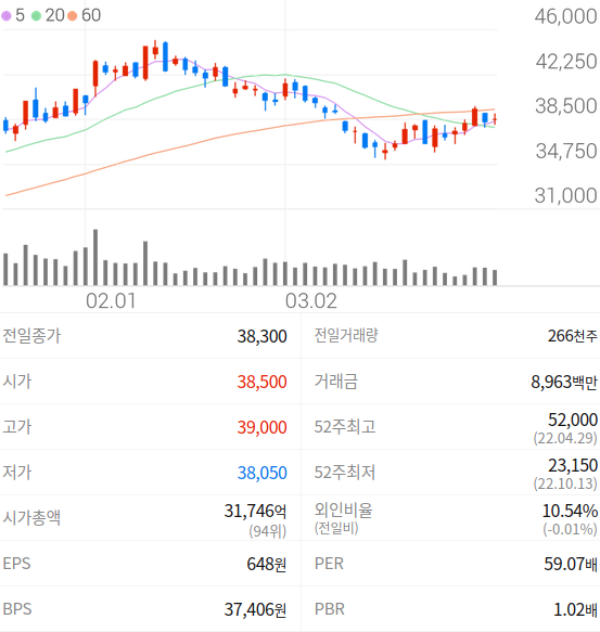 2023년 03월 31일 기준으로 아모레G의 주당 가격은 38,500원 입니다.