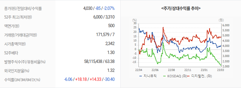 2023년 03월 31일 기준으로 지니뮤직의 주당 가격은 4,030원 입니다.