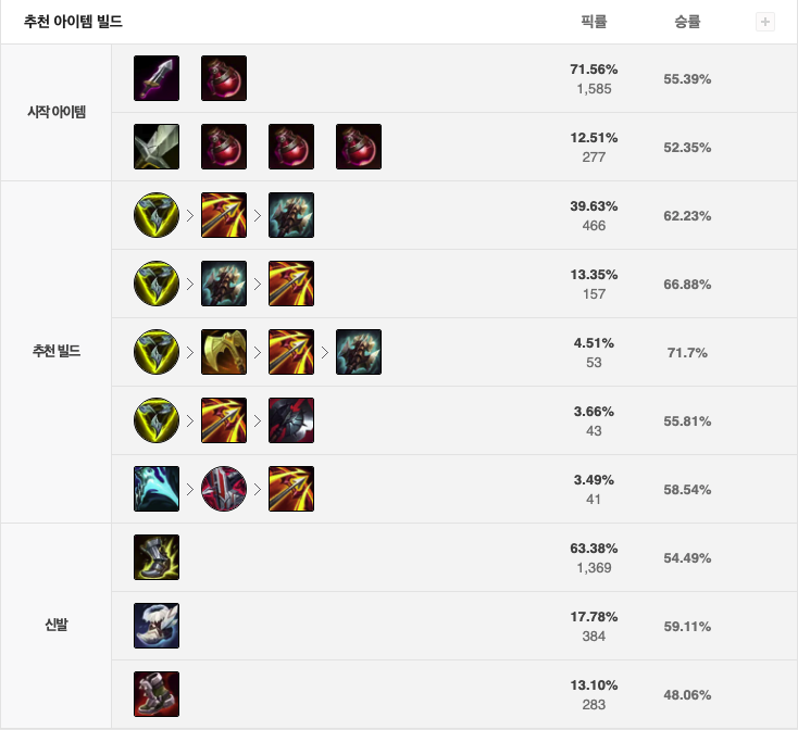 시작 아이템은 도란의 검 / 체력 물약으로 시작하고,