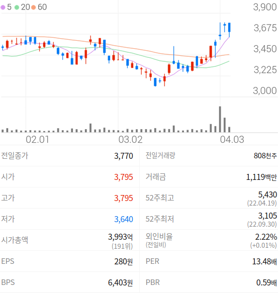 2023년 04월 03일 기준으로 삼표시멘트의 주당 가격은 3,655원 입니다.
