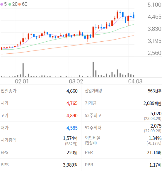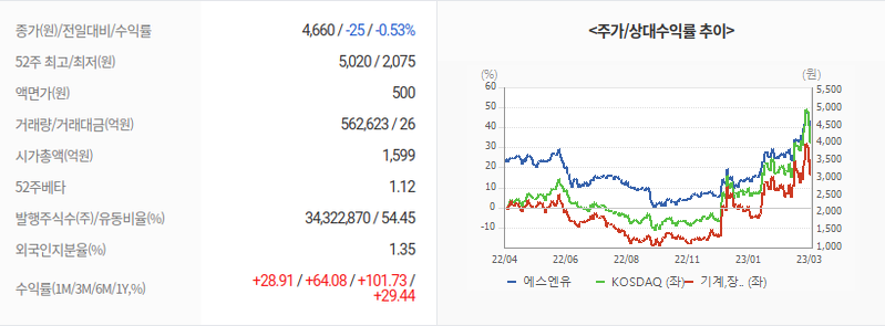 2023년 04월 03일 기준으로 에스엔유의 주당 가격은 4,685원 입니다.
