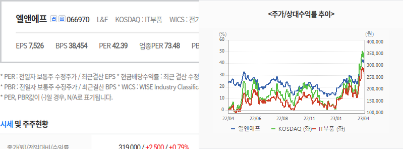 2023년 04월 10일 기준으로 엘앤에프의 주당 가격은 319,000원 입니다.