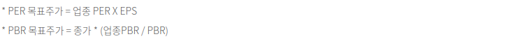 목표 주가를 산정하는 데 있어서 가장 많이 사용하는 방법중 하나인 PER 목표주가와 보수적인 PBR 목표주가를 계산합니다. PER 목표주가는 동종업계 평균 PER(14.71)을 적용해서 목표주가를 산정하고, PBR 목표주가는 동종업계 PBR 평균(1.81)을 기준으로 산정했습니다. 지표를 기반으로 계산한 목표주가이기 때문에, 현재 주가가 지표 대비 상대적으로 높은 경우에는 목표주가가 낮게 나올 수 있습니다.