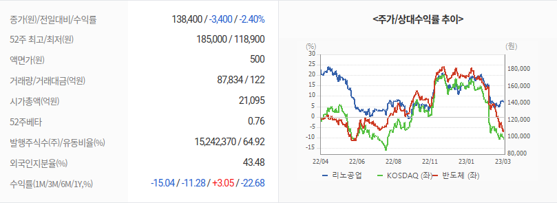 2023년 04월 03일 기준으로 리노공업의 주당 가격은 141,800원 입니다.