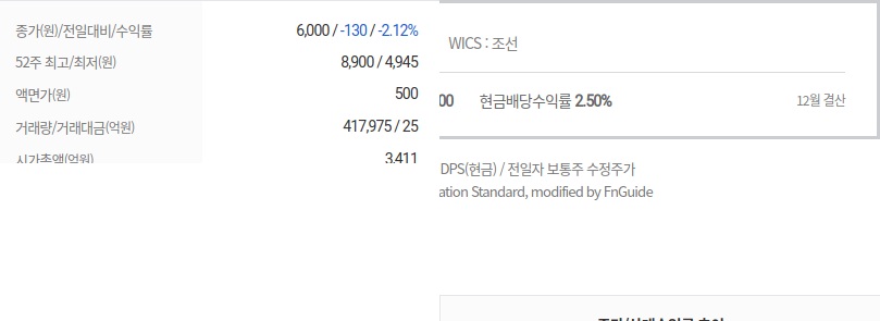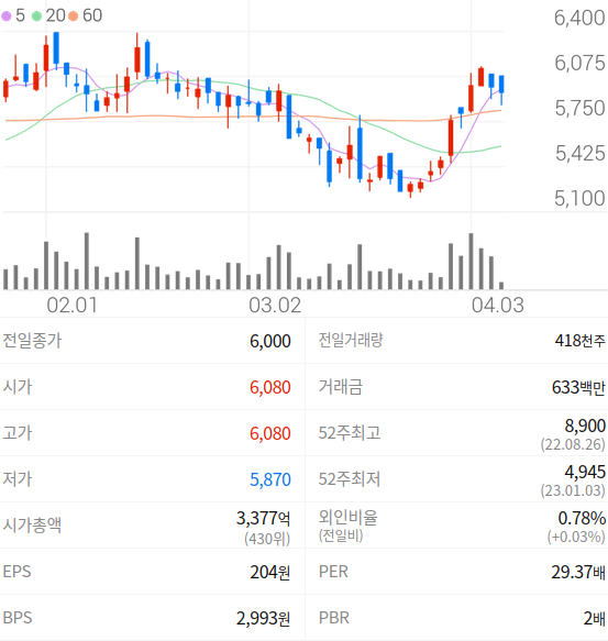 2023년 04월 05일 기준으로 세진중공업의 주당 가격은 6,000원 입니다.