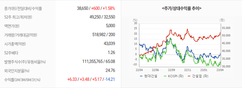 2023년 04월 11일 기준으로 현대건설의 주당 가격은 38,650원 입니다.
