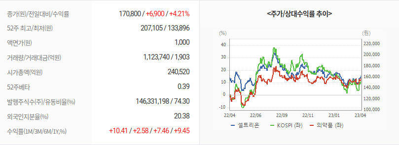 셀트리온의 최근 수익률은 1개월 10.41%, 3개월 2.58%, 6개월 7.46% 입니다.