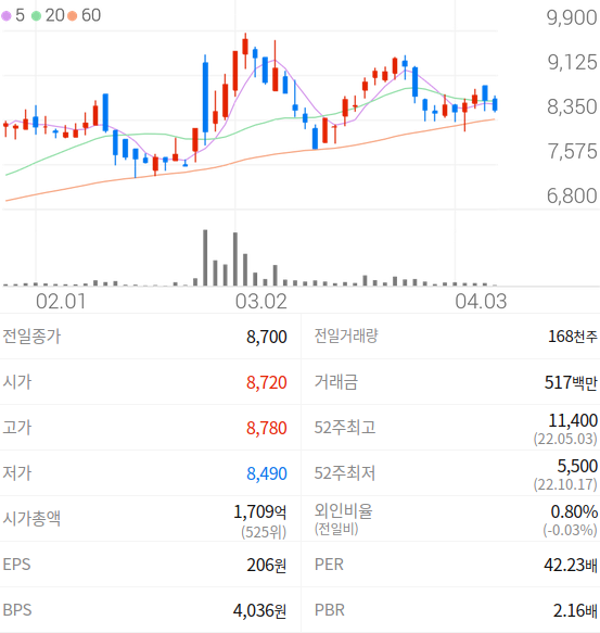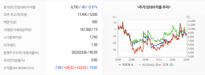 2023년 04월 06일 기준으로 제로투세븐의 주당 가격은 8,700원 입니다.