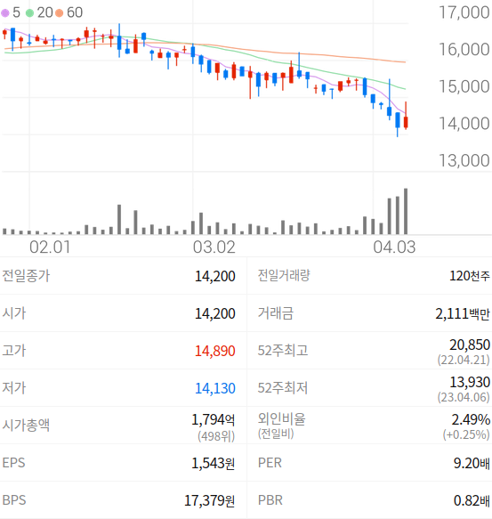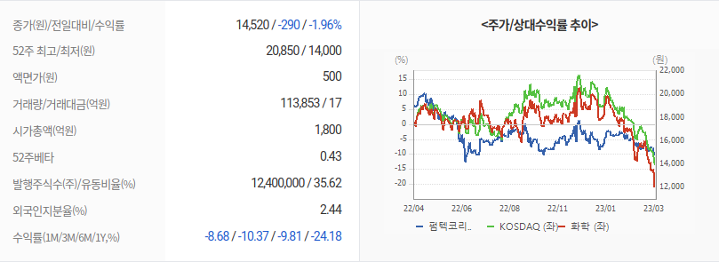 2023년 04월 06일 기준으로 펌텍코리아의 주당 가격은 14,200원 입니다.