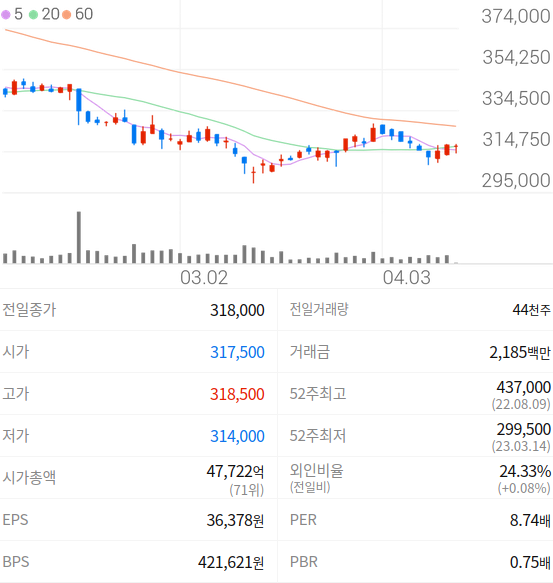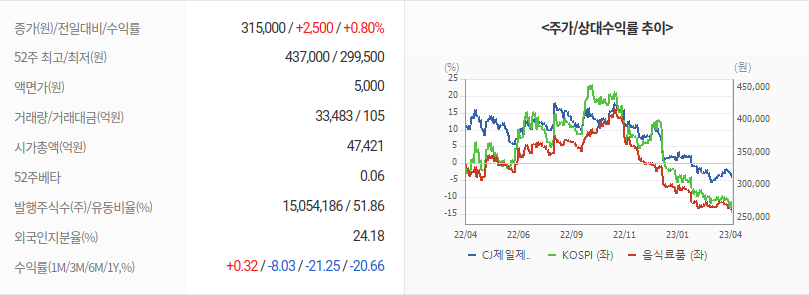 2023년 04월 12일 기준으로 CJ제일제당의 주당 가격은 318,000원 입니다.