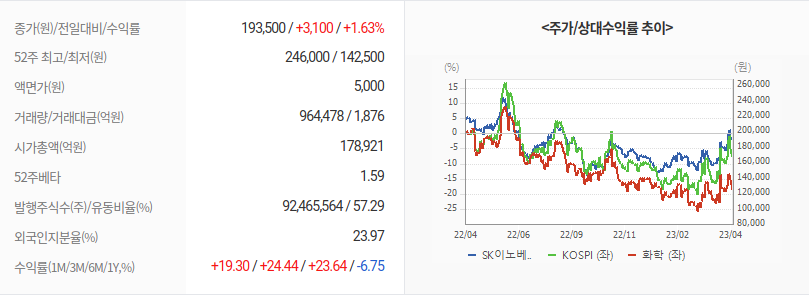 2023년 04월 17일 기준으로 SK이노베이션의 주당 가격은 193,500원 입니다.