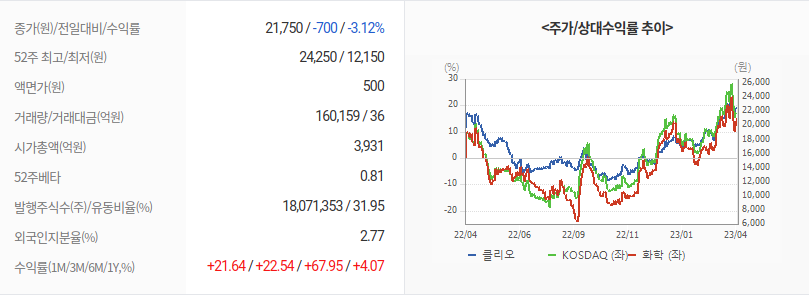 2023년 04월 14일 기준으로 클리오의 주당 가격은 21,750원 입니다.