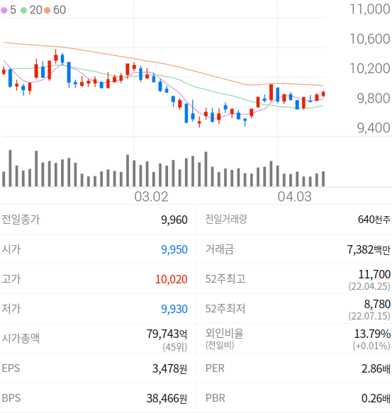 2023년 04월 11일 기준으로 기업은행의 주당 가격은 9,960원 입니다.