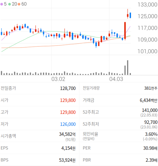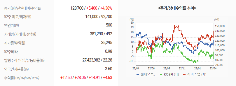 2023년 04월 12일 기준으로 현대오토에버의 주당 가격은 128,700원 입니다.