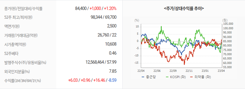2023년 04월 12일 기준으로 종근당의 주당 가격은 86,300원 입니다.