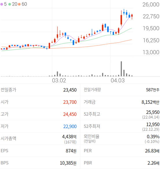 2023년 04월 12일 기준으로 덕산테코피아의 주당 가격은 23,450원 입니다.