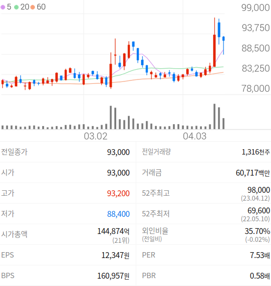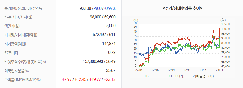 2023년 04월 14일 기준으로 LG의 주당 가격은 92,100원 입니다.