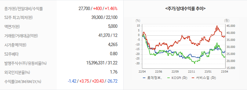 2023년 04월 14일 기준으로 롯데정보통신의 주당 가격은 27,700원 입니다.