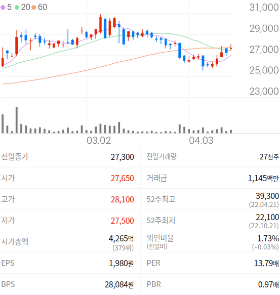 | 전일종가 : 27,700 원 | 롯데정보통신 과거 평균 지표 기준 | 동종업계 평균 지표 기준 |