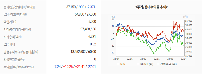 2023년 04월 17일 기준으로 SBS의 주당 가격은 37,150원 입니다.