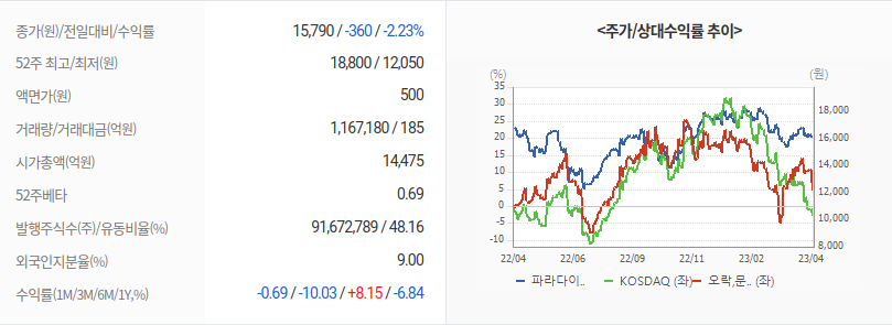 2023년 04월 17일 기준으로 파라다이스의 주당 가격은 15,790원 입니다.