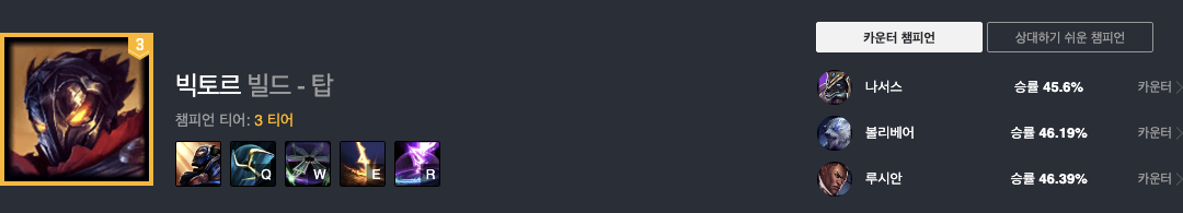 빅토르는 현재 승률 49.23%로 3티어 챔피언입니다.