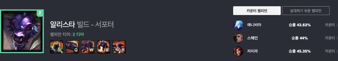 알리스타는 현재 승률 50.16%로 2티어 챔피언입니다.