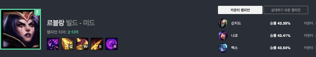 카운터 챔으로 신지드 / 니코 / 벡스가 있으므로, 밴해주시면 되겠습니다.