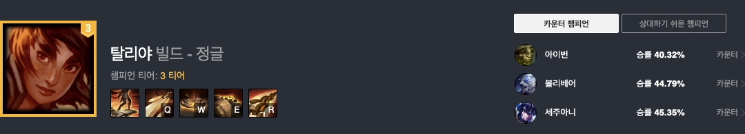 탈리야는 현재 승률 51.22%로 4티어 챔피언입니다.
