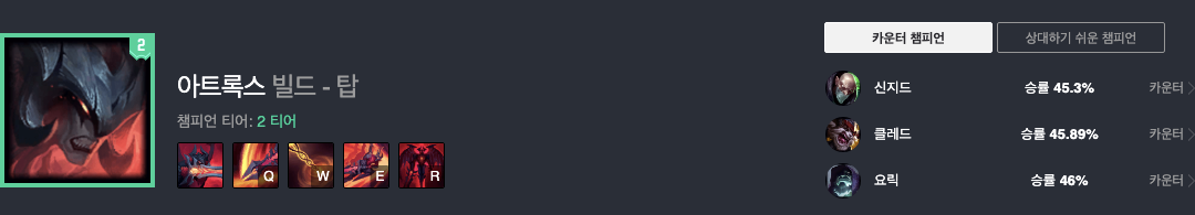 아트록스는 현재 승률 49.41%로 3티어 챔피언입니다.