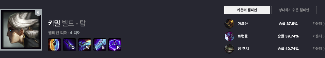 카밀는 현재 승률 50.35%로 2티어 챔피언입니다.