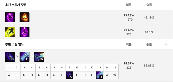 스킬 빌드는 Q - E - W 순서로 마스터 해주면 됩니다.