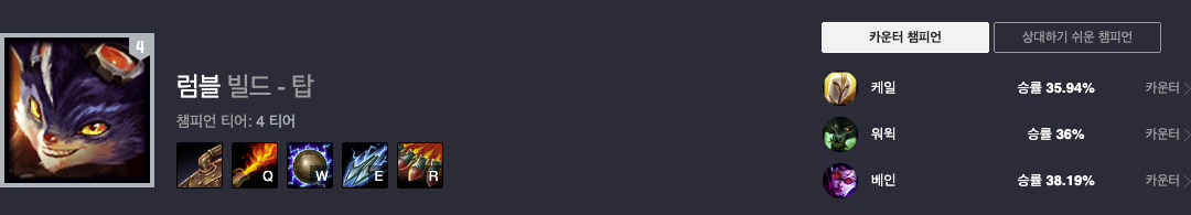 럼블는 현재 승률 47.86%로 5티어 챔피언입니다.