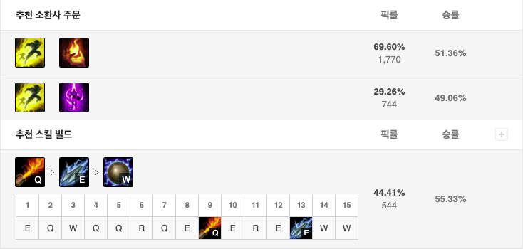 스킬 빌드는 Q - E - W 순서로 마스터 해주면 됩니다.