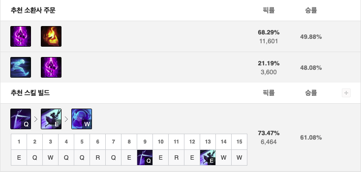 소환사주문은 순간이동 / 점화를 들어주시고, 스킬 빌드는 Q - E - W 순서로 마스터 해주면 됩니다. 다만, 1렙 스킬은 E를 먼저 찍어줍니다.