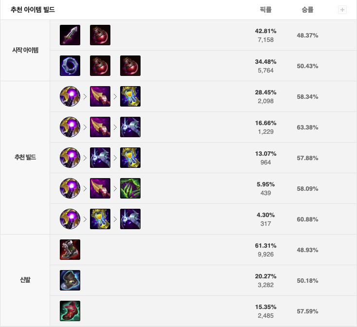 시작 아이템은 도란의 검 / 체력 물약으로 시작하고, 최종적으로는 내셔의 이빨 / 존야의 모래시계 / 균열 생성기을 주로 갑니다. 이 외에 상대 조합이나 상황에따라 우주의 추진력을 가시면 되겠습니다.