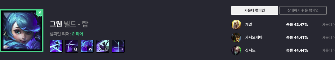 그웬는 현재 승률 50.01%로 2티어 챔피언입니다. 카운터 챔으로 케일 / 쉬바나 / 카시오페아가 있으므로, 밴해주시면 되겠습니다.