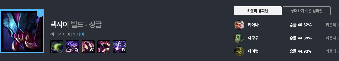 렉사이는 현재 승률 53.5%로 1티어 챔피언입니다.