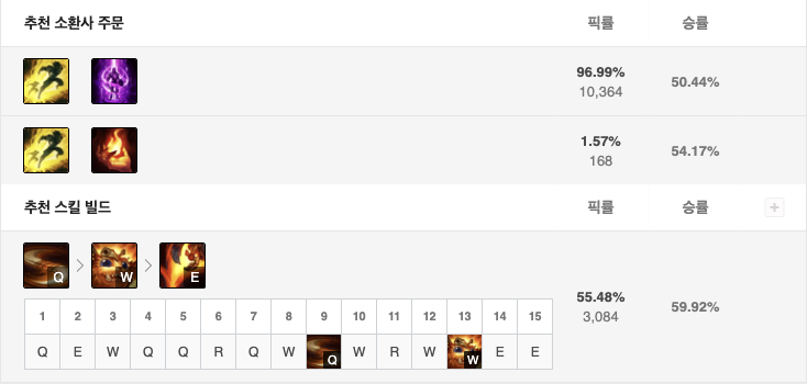 스킬 빌드는 Q - W - E 순서로 마스터 해주면 됩니다.