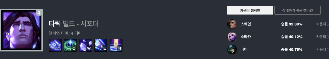 타릭는 현재 승률 53.08%로 3티어 챔피언입니다.