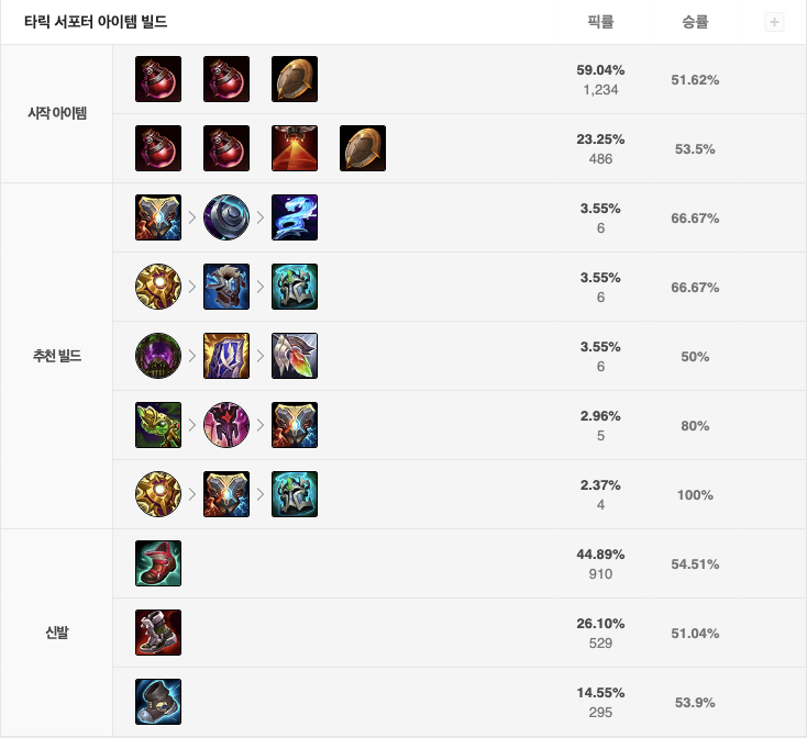 타릭는 현재 승률 53.08%로 3티어 챔피언입니다.