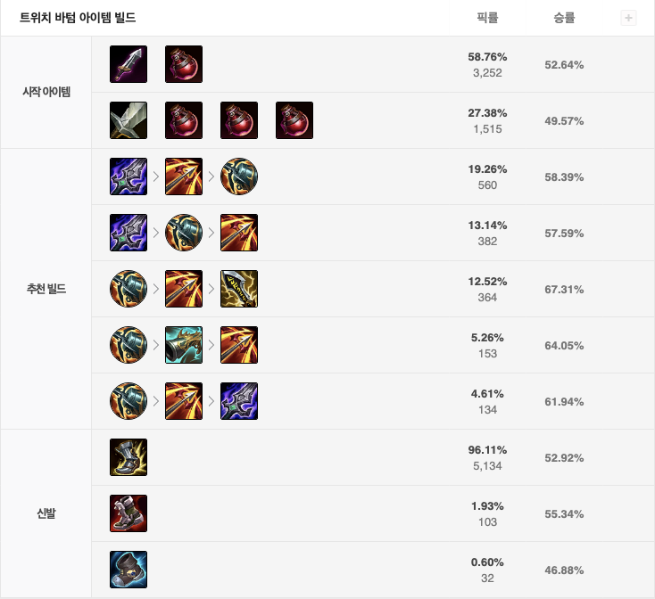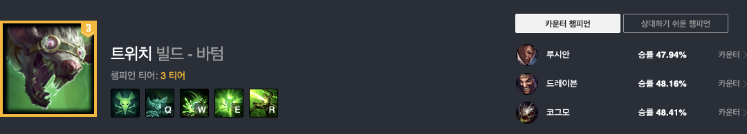 트위치는 현재 승률 50.64%로 4티어 챔피언입니다.