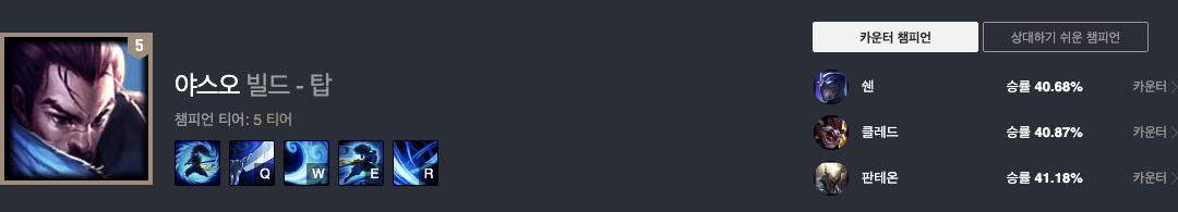 야스오는 현재 승률 47.51%로 5티어 챔피언입니다.